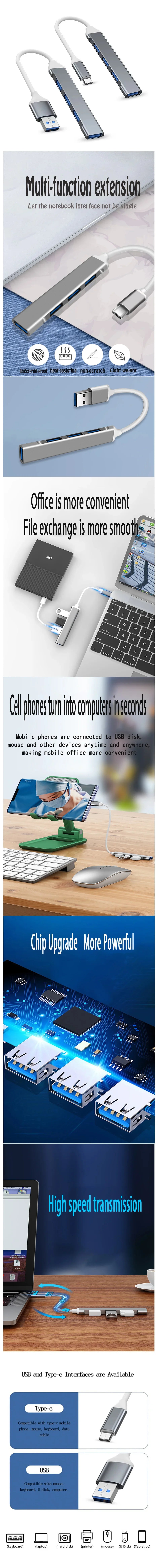 • 4-in-1 Multiport Adapter :This USB Type C HUB MINI USB3.1 Multi 4 Port 4 in 1 Aluminum Alloy Splitter Adapter OTG is a versatile device that can connect four different devices to your laptop or computer.